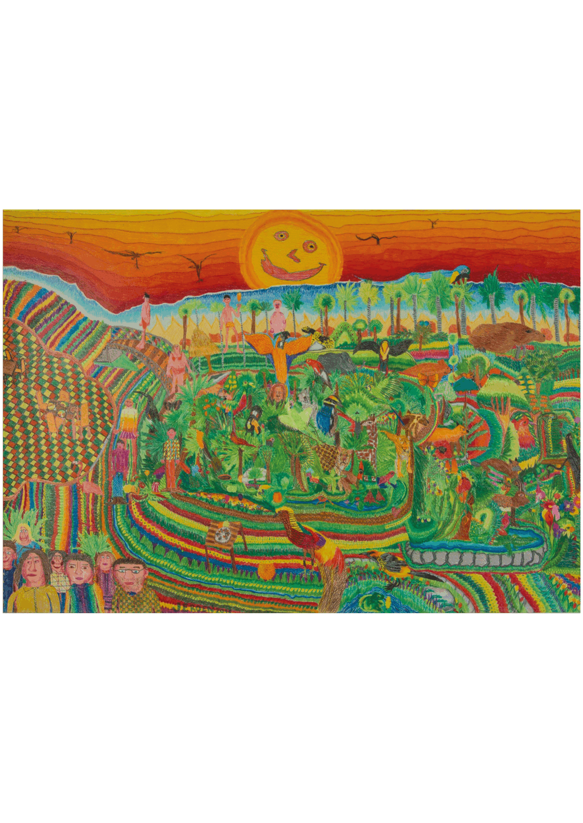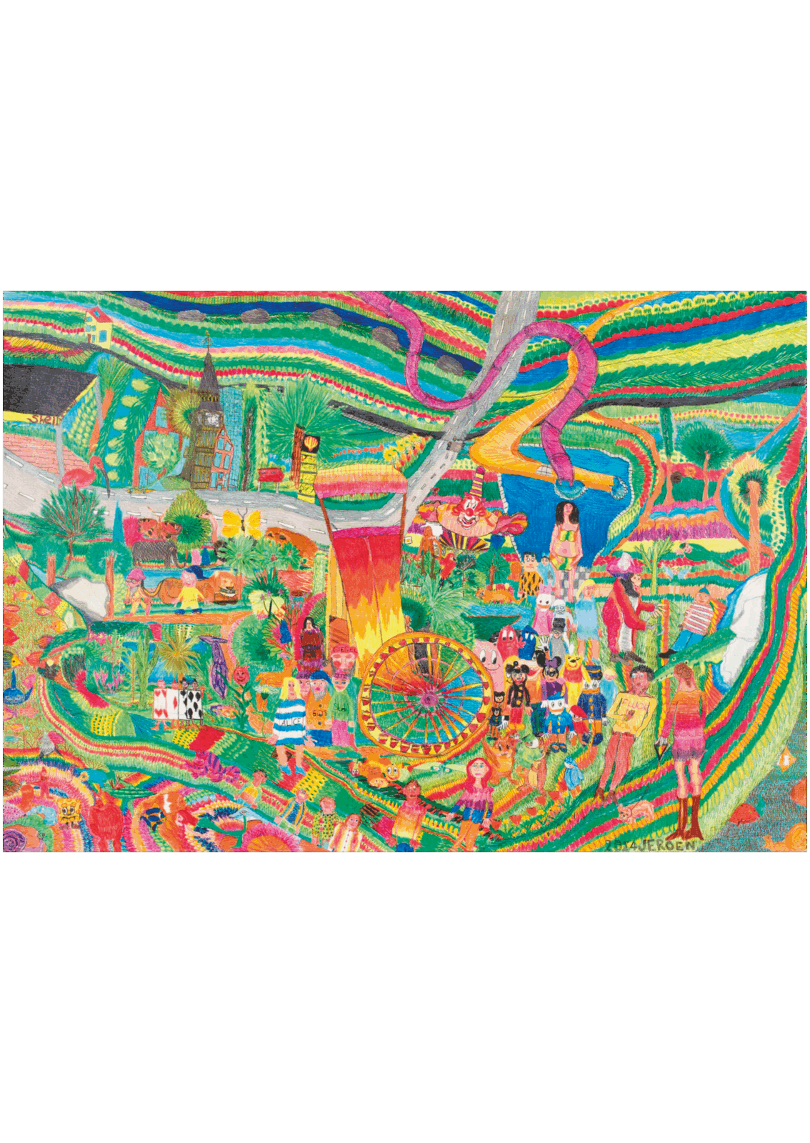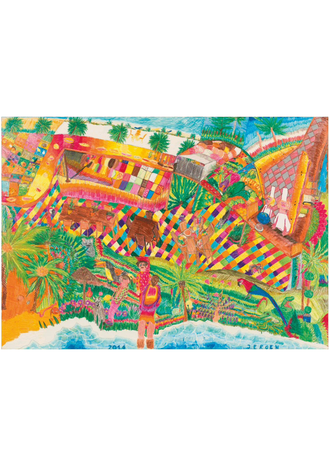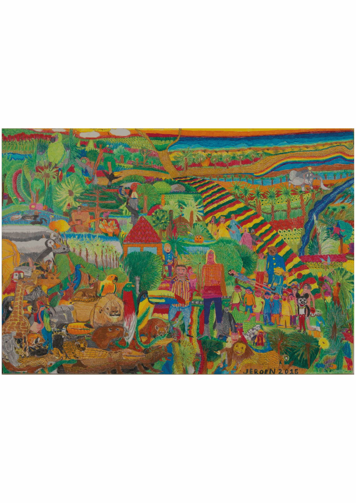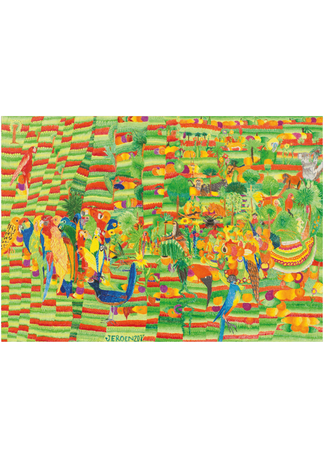De tekeningen van Jeroen, die hij met kleurpotlood op papier zet, worden gekenmerkt door een grote diversiteit aan onderwerpen. Jeroen past het “Horror Vacui” toe, het papier is van boven tot onder vol getekend, nergens is het wit van het papier zichtbaar. Vruchten, dieren, bloemen, planten, stadsgezichten, wegen met auto’s, rails met treinen, bladvullend, vanuit een vogelperspectief en met encyclopische kennis op papier getekend. Zijn werk laat een enorme diversiteit aan onderwerpen zien. Het is bijzonder om kennis te maken met zijn wereld in kleurpotlood.