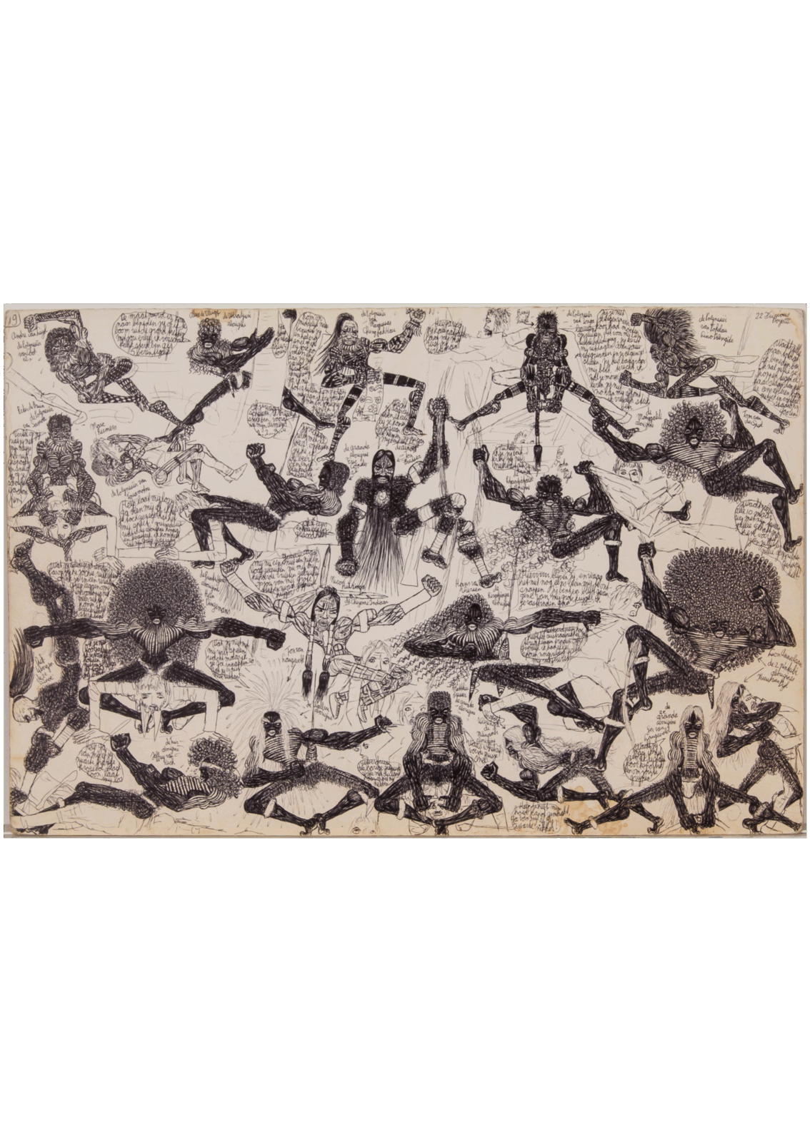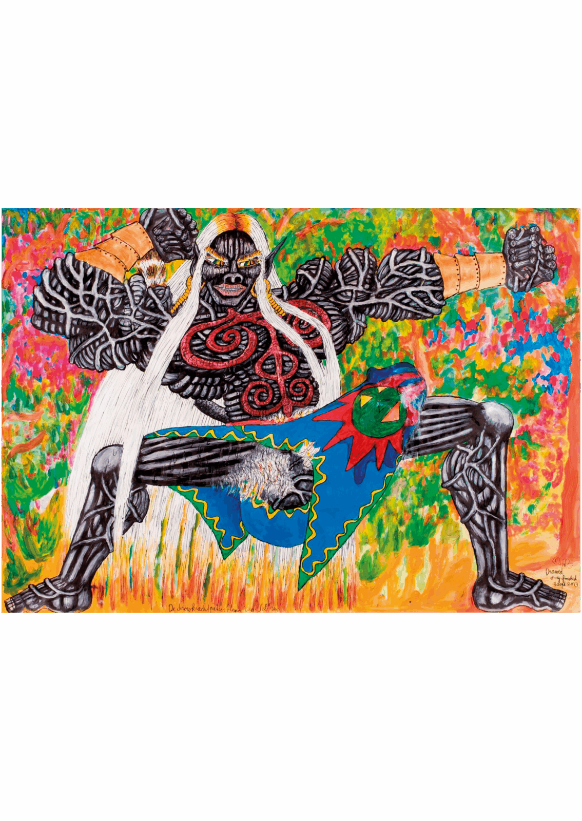 Usually Hein provides his work with long titles in which the name and surname of the folk and tribe are mentioned. As a joke, now and then he gives the name of a band or a friend to the painting. Sometimes Hein also names his figures after himself. ‘That is perhaps what I would like to look like, but then to a lesser degree.’ Hein says he draws his potential alter egos as a form of sexual release. ‘Because of a light form of handicap it’s difficult for me to get a girl: making contact’s a problem, a sort of shyness. I draw as an outlet for my sexual needs.’