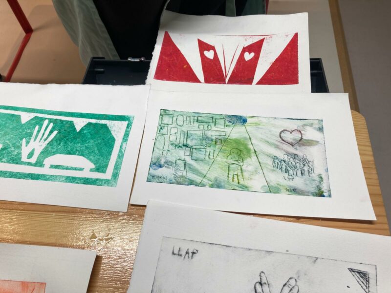 Met behulp van zeefdruk, ets of en linosnede is in de mobiele drukkerij “emotioneel kapitaal” gedrukt.